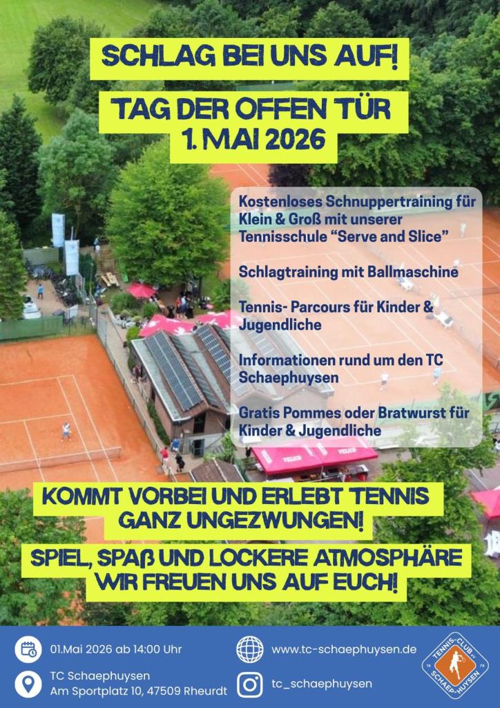 Tennis — Sport und Gemeinschaft! Diese Homepage ist zur Nutzung durch die Vereinsmitglieder und Freunde des Vereins vorgesehen. Wir bieten Tennis Breitensport mit sportlichen Highlights auf einer sehr schönen Anlage im Grünen mit echtem Clubleben und Clubhausbewirtung wie in alten Zeiten – für die Region Rheurdt, Schaephuysen, Tönisberg, Hochkamer, Saelhuysen, Kengen, Sevelen, Rayen, Vluyn, Neukirchen-Vluyn, Moers, Aldekerk bis nach Duisburg